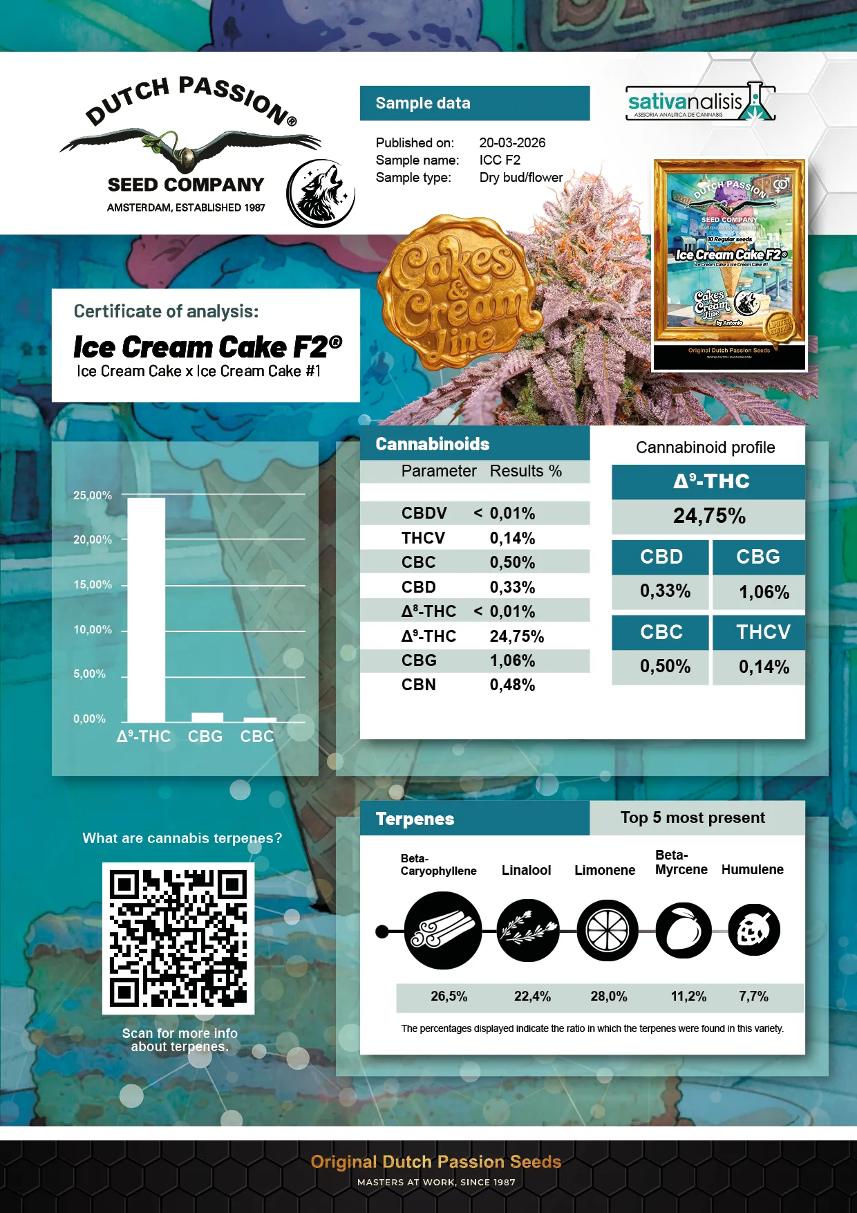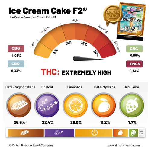 Ice Cream Cake (Wedding Cake x Gelato 33) F2 je součástí limitované edice regulérních semen od spolupracujícího šlechtitele Antonia z řady Cakes & Cream, která nabízí něco pro každého pěstitele s 5 odrůdami v podobě regulérních semen! S odrůdami jako Pink Runtz Cake, Sherblato Cake, White Gushers Cake a Peaches & Cream můžete objevit řadu báječných fenotypů, které mají specifické vlastnosti.