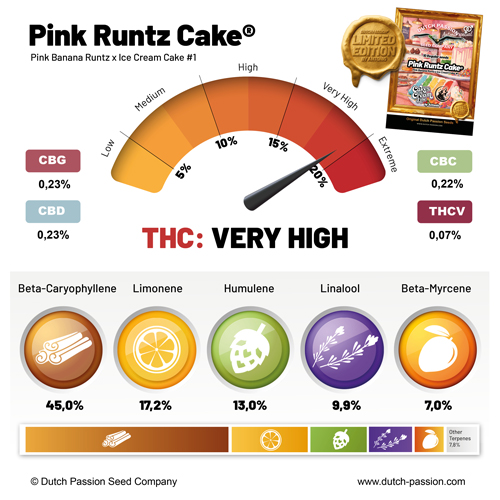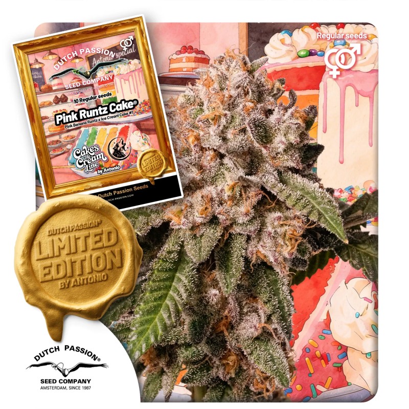 Pink Runtz Cake je součástí limitované edice regulérních odrůd od Antonia: řady Cakes & Cream. Tato řada nabízí 5 regulérních variet, takže si každý pěstitel najde tu svou! S odrůdami jako Ice Cream Cake F2, Sherblato Cake, White Gushers Cake a Peaches & Cream můžete objevovat širokou škálu chutí, vůní a účinků. Každá z nich má své specifické vlastnosti. Z některých rostou spíše velké a silné rostliny, zatímco jiné kvetou o něco rychleji a/nebo mají neskutečně zajímavý terpenový profil. Všechny tyto odrůdy jsou každopádně hodně potentní a spadají do kategorie semen s extrémně vysokým obsahem THC.