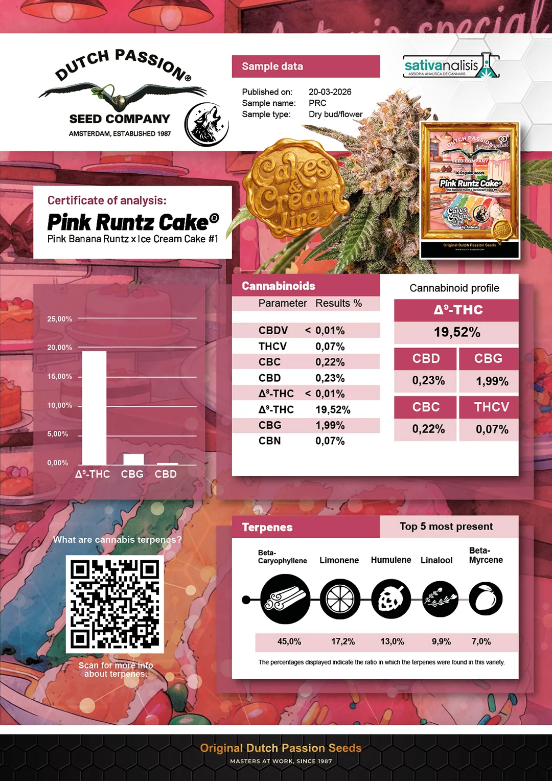 Semena konopí Pink Runtz Cake produkují jak samčí, tak samičí rostliny s jedinečným vzhledem a bohatým terpenovým profilem. Právě oku lahodící barvy v kombinaci s charakteristickou vůní a chutí činí tuto odrůdu hodnou vaší pozornosti a místečka na zahradě nebo v pěstebním stanu. Představte si lahodný dezert, kde se sladký banán snoubí s krémovými tóny sladkého pečiva. To vše zaplaví ovocná vůně šmakozního dezertu. Ano, je to kombinace, která vás stoprocentně donutí chtít víc a víc! Jako dítě v cukrárně si užijete rozmanitost terpenů a finální chuťovou explozi.