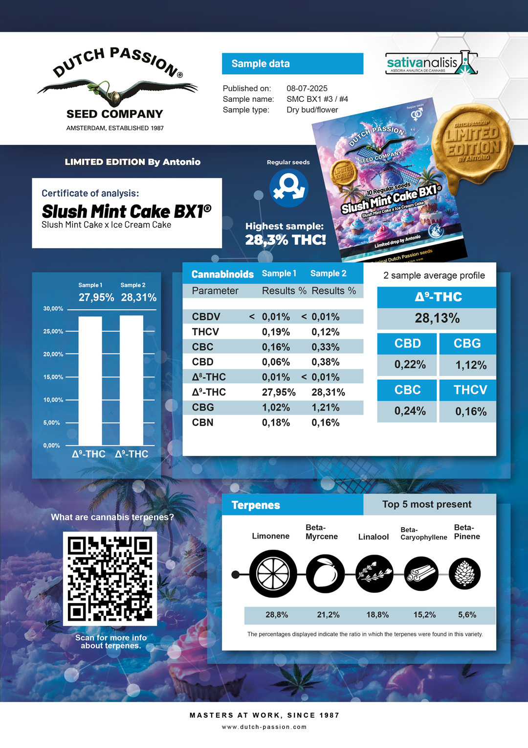 Diese Rückkreuzung bewahrt die herausragenden Eigenschaften der ursprünglichen Mutterpflanze, wie dichte, klebrige, harzige Blütenstände, ein intensives Terpenprofil und extrem hohe Cannabinoidwerte. Nach einer Reihe unabhängiger Labortests erwies sich diese reguläre BX1-Samenversion als noch potenter als die feminisierte Originalsorte. Der THC-Gehalt kann über 28 % (Delta-9-THC) erreichen – einer der höchsten Werte, die wir in unserer langjährigen Zusammenarbeit mit verschiedenen europäischen Laboren je gemessen haben.